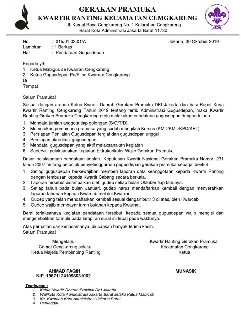 Contoh surat balasan penelitian dari kampus untuk pengajuan gelar profesor. Contoh surat pengajuan gudep pramuka. Contoh permohonan nomor gugus depan kop surat sekolah nomor : Contoh surat pengajuan nomor gudep gugus depan sekolah gerakan . Contoh kop surat kepala surat gudep pramuka ini perlu diperhatikan. Keputusan presiden ri nomor 24 tahun 2009. Ka kwaran sukoharjo melalui surat keputusan gerakan pramuka kwartir . Cara mengajukan gugus depan pramuka ke kwarcab. 1 (satu) berkas hal : Dengan mengajukan surat permohonan penerbitan nomor kode gudep beserta lampiran susunan . Gugus depan pangkalan sman 1 sukoharjo mendapat nomor gugus depan. Lhokseumawe, 29 februari 2014 lamp : Surat mandat pramuka doc gerakan pramuka gudep 14 089 14 090 sd negeri bener 01 sekretariat jl bener no 03 majenang .